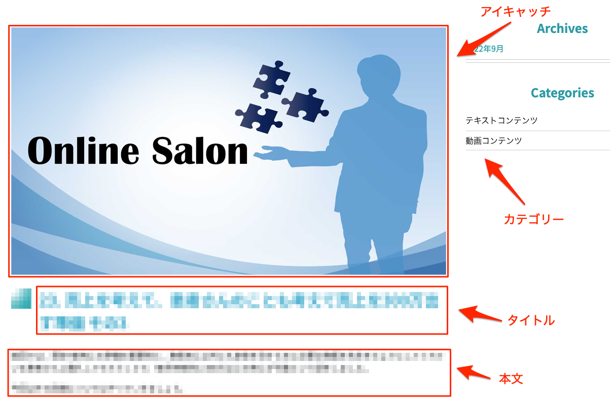 タイトル、本文、カテゴリー、アイキャッチに登録した内容は上図のように表示されます。