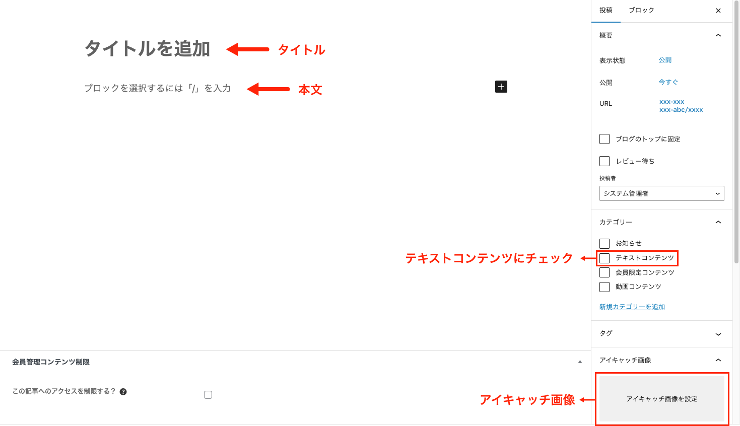 テキストコンテンツを追加し、会員毎の表示/非表示などを設定することができます。