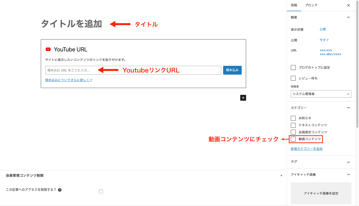 タイトル、YoutubeリンクURL、カテゴリー、アイキャッチ画像