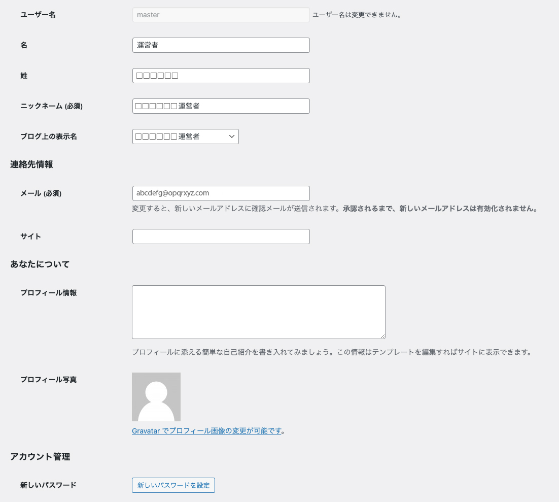運営管理画面から【ユーザー名】>【プロフィール】をクリックします。