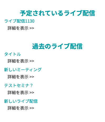 登録されたライブ配信は、会員コンテンツページの右側にリストとして表示され、ライブ名をクリックするとその詳細が開きます。